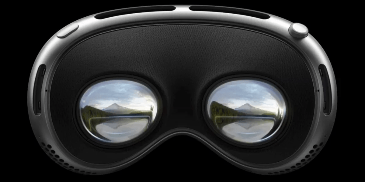 Tres componentes electrónicos surgen del dispositivo Vision Pro en la parte inferior de la página. Cada uno de los tres componentes es un conjunto de dos imágenes que se encuentran delante y detrás de los otros componentes, como los subrollos de un panecillo de hot dog que rodea un palito de pan. (Sí, es una analogía extraña, pero entiendes la idea, ¿no?)