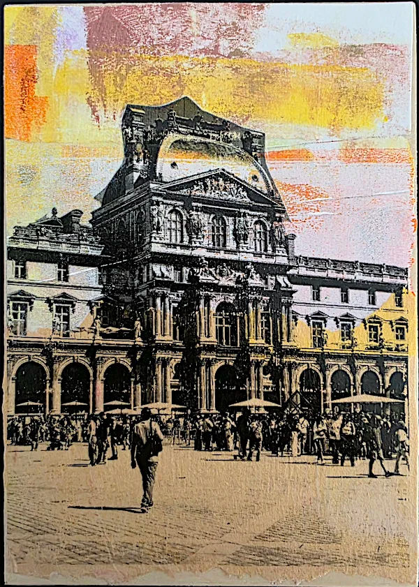 Tomé esta foto con mi teléfono el verano pasado mientras nos acercábamos al Museo del Louvre en París (el tipo en primer plano sosteniendo el bolso de la cámara es mi esposo).