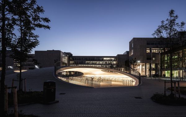 Haus Gables presenta cuentas de vidrio incrustadas en el estuco, creando una superficie de imitación de ladrillo que refleja la luz y crea una piel brillante.