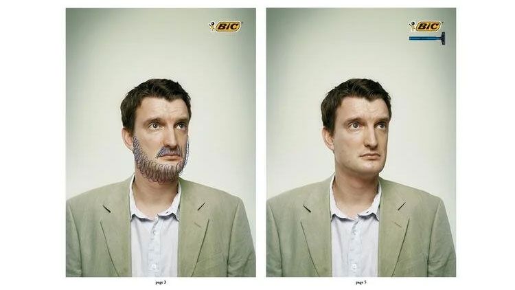 El famoso anuncio impreso de Bic, producido por JWT Amsterdam, utiliza la misma fotografía para promocionar ambos productos. Ambos muestran a un hombre. En una de las fotos, el hombre tiene barba y bigote dibujados con bolígrafo, y en la siguiente, está bien afeitado.