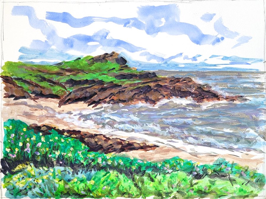 Dirígete a Bean Hollow State Beach en Pescadero, California, con nuestro grupo de pintura. 12×9" aguada sobre papel; 8.5×5.5" Acuarela y tinta sobre papel. B. Charlow 2026. Todavía no tengo mucha sensibilidad para el gouache, pero tampoco es terrible.