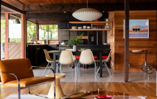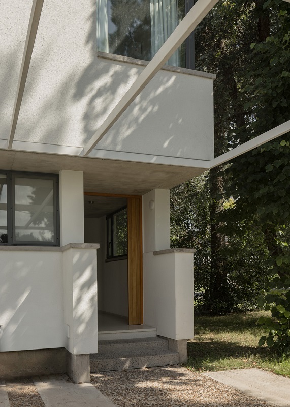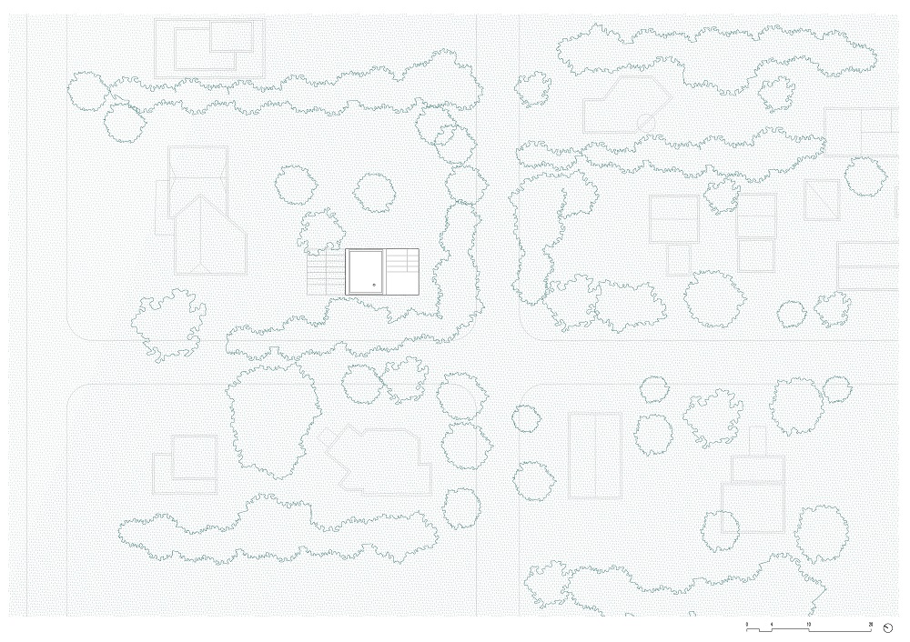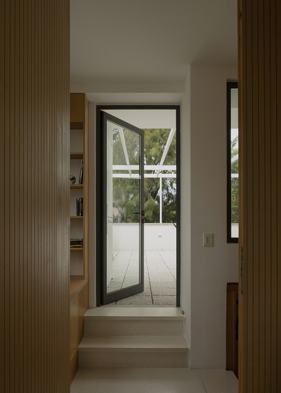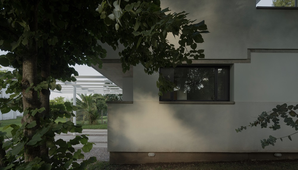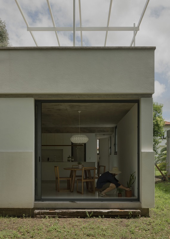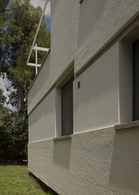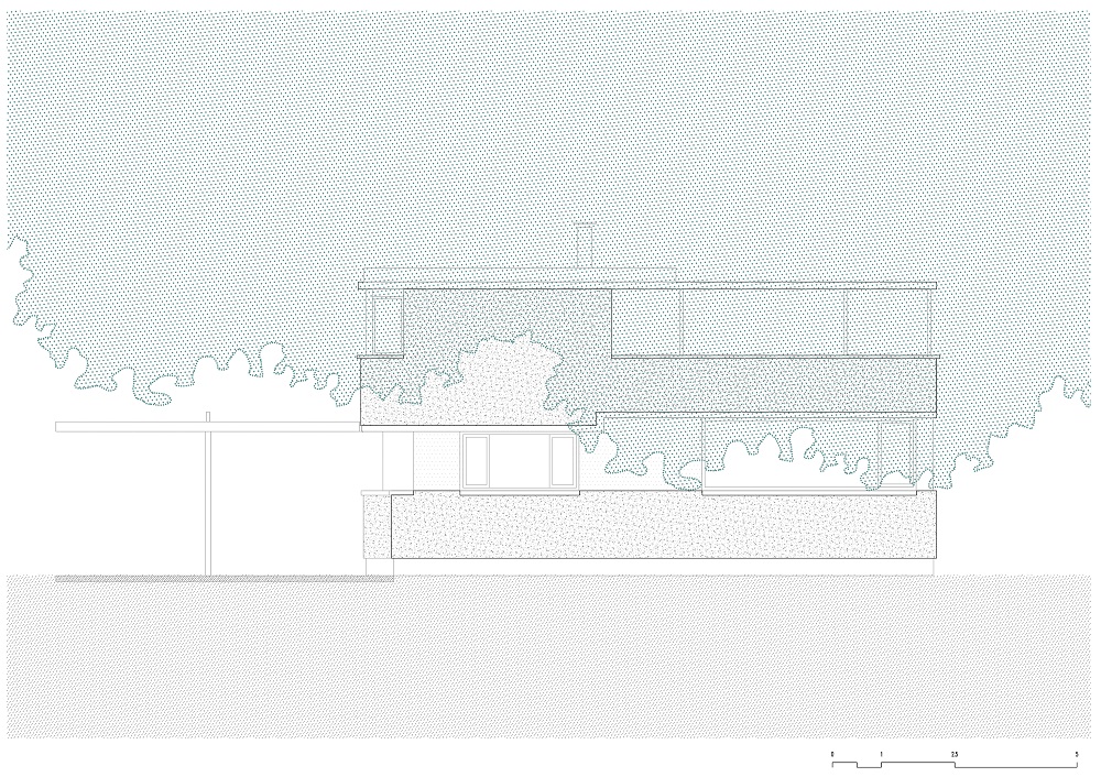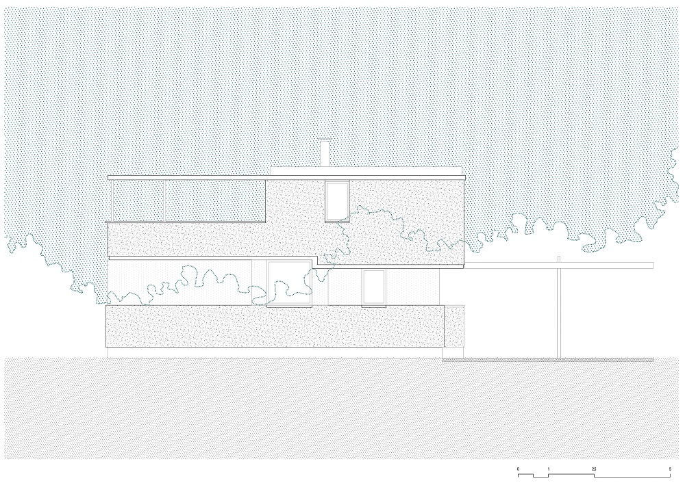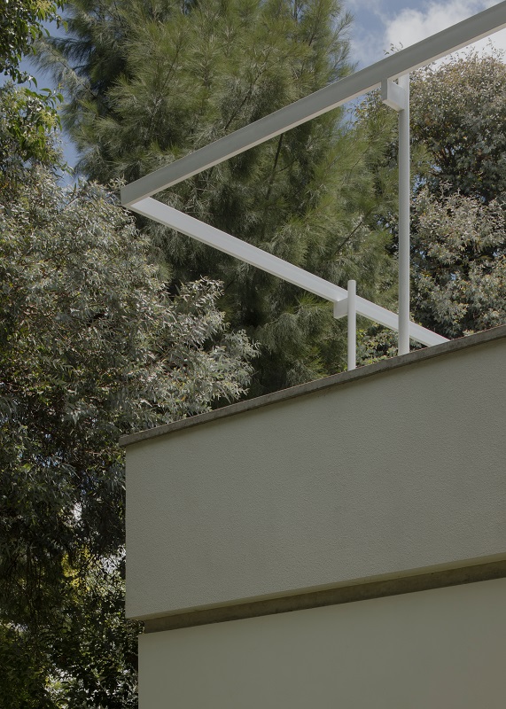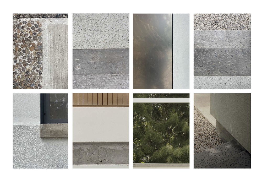 El lenguaje de la casa busca armonizar con una serie de residencias vecinas de los años 1960 y 1970. Esta composición (variaciones de losas gruesas, hormigón visto en paredes y aberturas, estructuras de acero pintadas de blanco pálido y estuco expuesto) establece un lienzo material monocromático que realza el entorno natural.