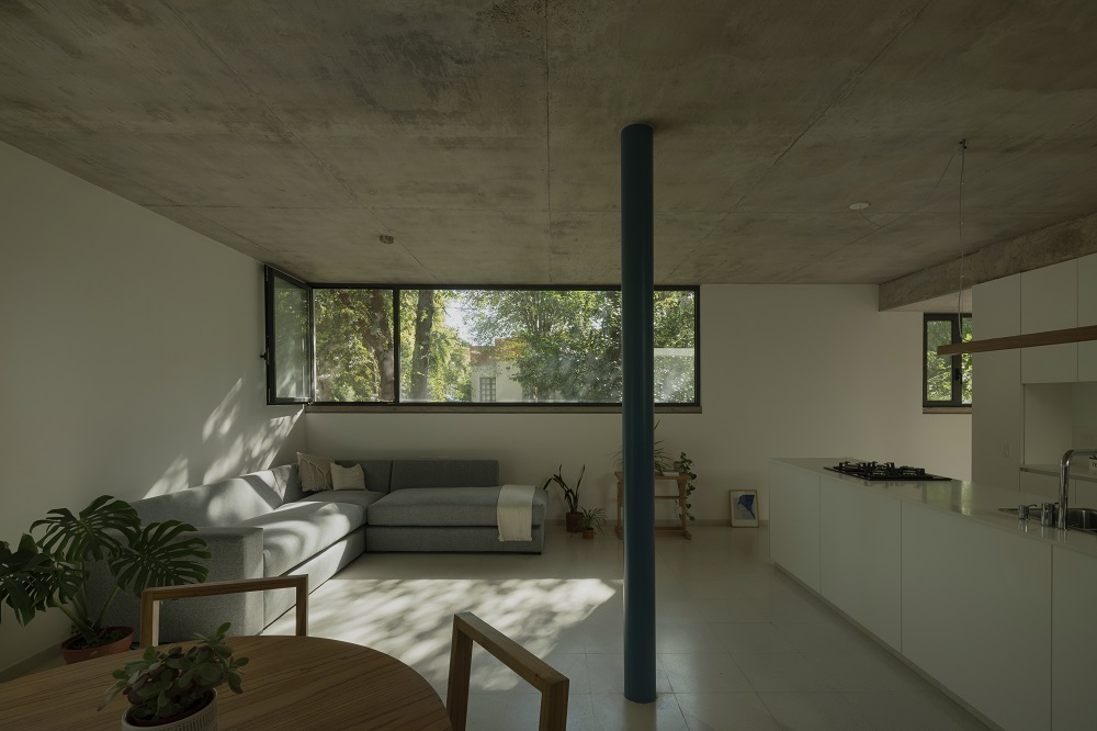 La mayor parte de los usos públicos se destinan a la planta inferior: cocina, comedor y salón se integran para potenciar sus superficies y posibilidades. En este nivel, la casa se concibe como un lugar para la vida diaria, incluyendo un espacio de estudio que puede ampliarse y flexibilizar el estilo de vida. El baño acompaña estas dinámicas y funciona de manera flexible para cumplir diferentes funciones. Dos elementos dominan la geometría y organizan la circulación: la isla de la cocina y las columnas cilíndricas de acero pintadas de azul.