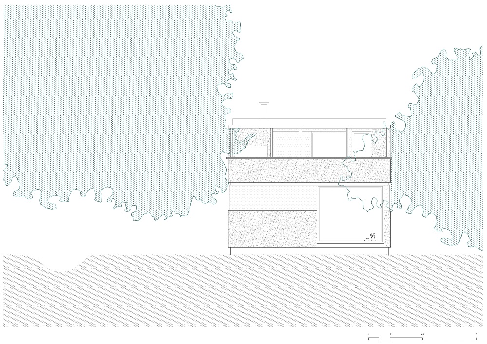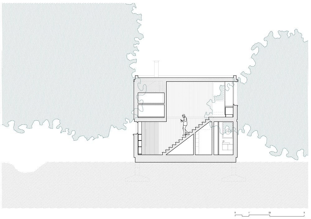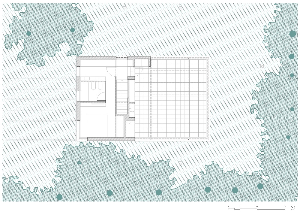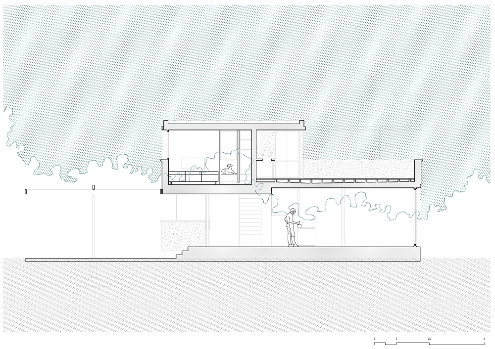 Una escalera cubierta con fragmentos de granito proporciona continuidad material entre los dos niveles. Se sitúa en el eje donde el forjado se rompe y cambia de nivel, permitiendo acoger las instalaciones de las plantas superiores y reduciendo la escala del entorno de la planta baja. La terraza de la planta superior orientada al este configura un nuevo espacio habitable, controlando el clima en dos sentidos: en verano, refrescándose bajo el denso dosel de eucaliptos y pinos; en invierno, el fuego sirve como elemento de reunión. La terraza se concibe como una actividad porque resume la experiencia compartida de estrecho contacto con los árboles.