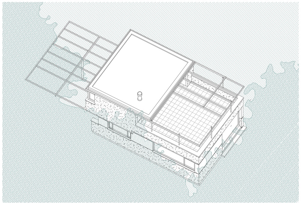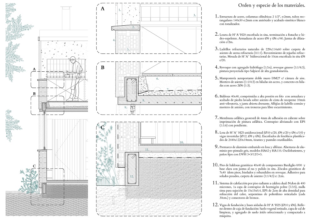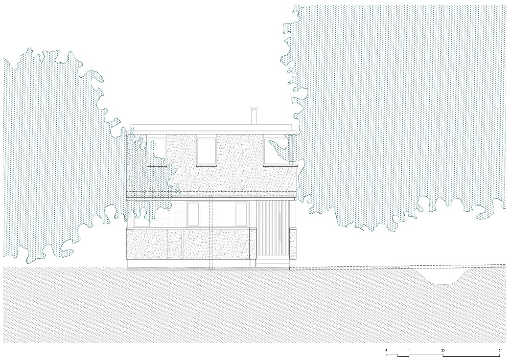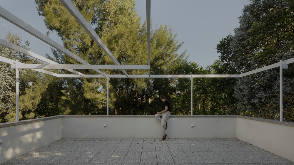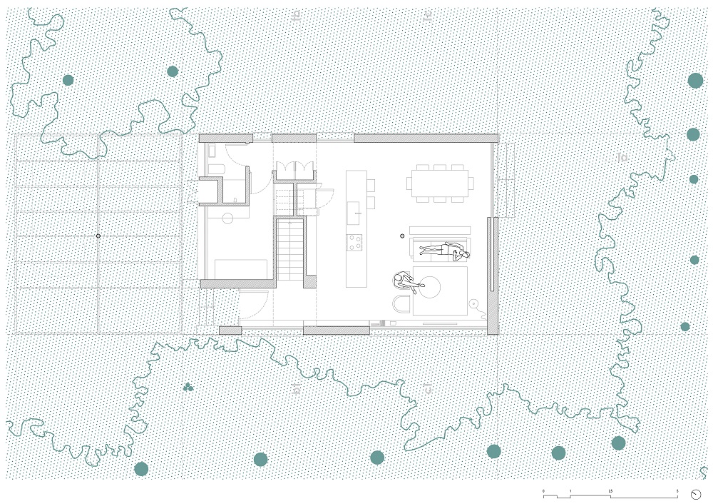 Una escalera cubierta con fragmentos de granito proporciona continuidad material entre los dos niveles. Se sitúa en el eje donde el forjado se rompe y cambia de nivel, permitiendo acoger las instalaciones de las plantas superiores y reduciendo la escala del entorno de la planta baja. La terraza de la planta superior orientada al este configura un nuevo espacio habitable, controlando el clima en dos sentidos: en verano, refrescándose bajo el denso dosel de eucaliptos y pinos; en invierno, el fuego sirve como elemento de reunión. La terraza se concibe como una actividad porque resume la experiencia compartida de estrecho contacto con los árboles.