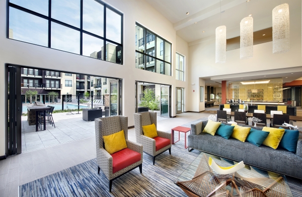 Las paredes de vidrio plegables extienden el interior de los apartamentos Axis hacia espacios de servicios compartidos, creando un flujo continuo entre las áreas de estar privadas y las áreas comunitarias.