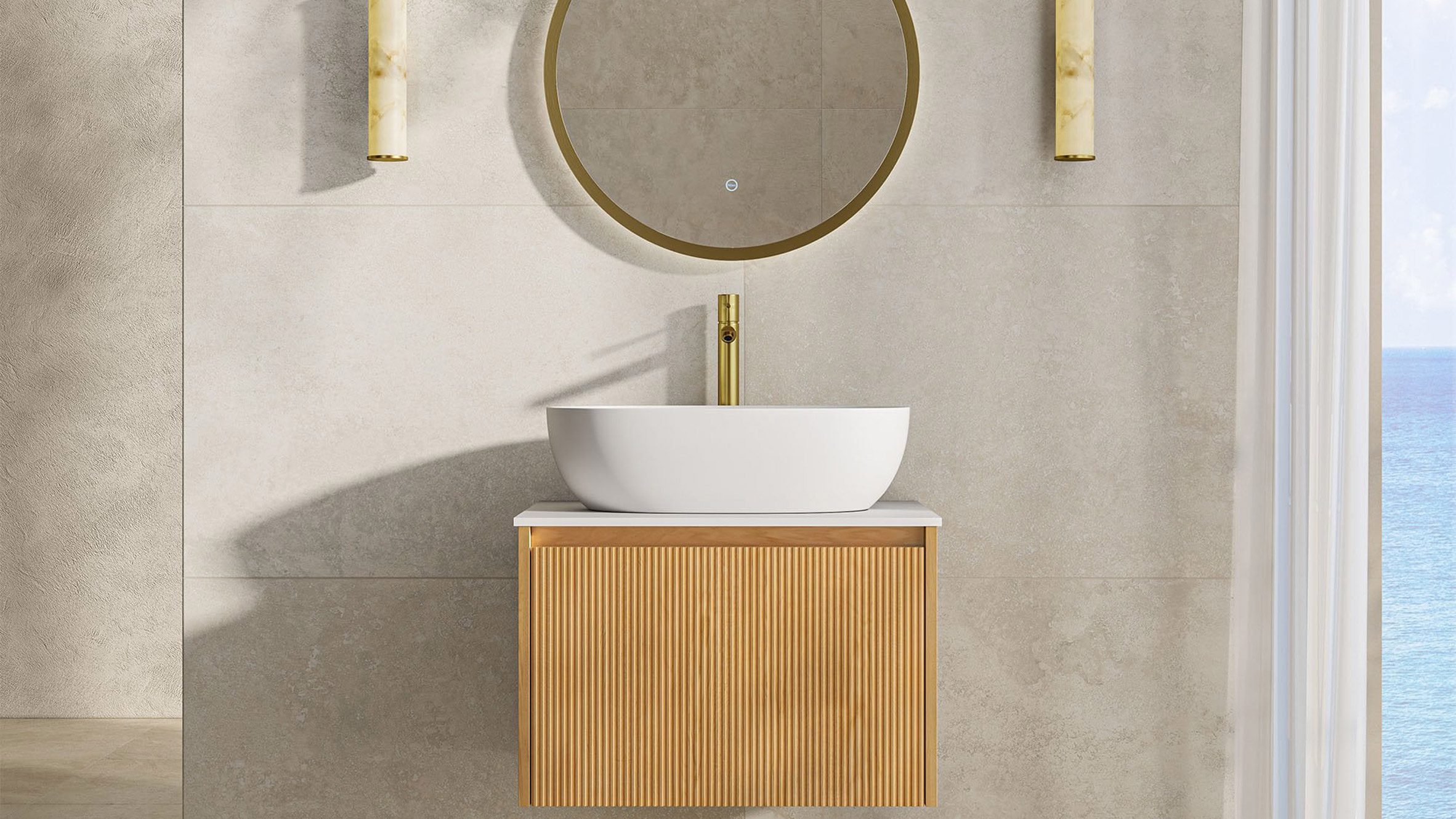 Los lavabos de piedra blanca están disponibles en longitudes de 800 mm y 1000 mm, mientras que los accesorios elevados están disponibles en longitudes de 600 mm, 800 mm y 1500 mm.
