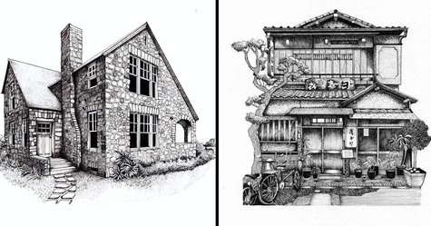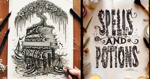 Intrincados dibujos de fantasía con tipografía y tinta.