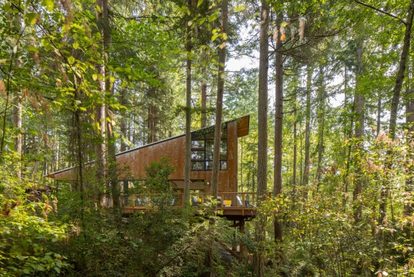 El revestimiento de acero de Corten envuelve la fachada restaurada, que ofrece acabados duraderos y estética moderna en la estructura