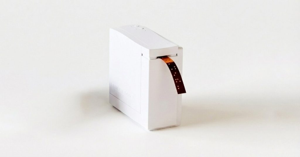 Una aplicación móvil permite a las personas con discapacidad visual imprimir etiquetas Hay dos conceptos de Nemonic Dot: impresora y un teléfono móvil aplicación Convierta texto hablado y escrito en texto impreso etiqueta...