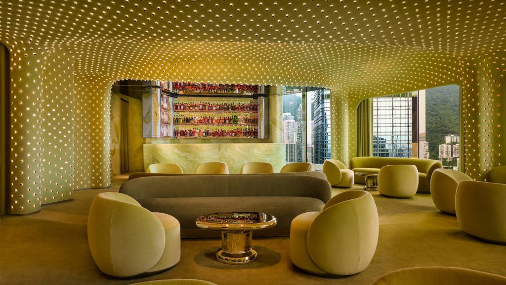 Este bar verde lima en Toronto tiene más de 20.000 luces parpadeantes estudio paul ferrarien la cima Henderson por Zaha Hadid Architects en Hong Kong. peridoto El restaurante en el piso 38 ofrece a los huéspedes cócteles botánicos preferentemente fermentados...