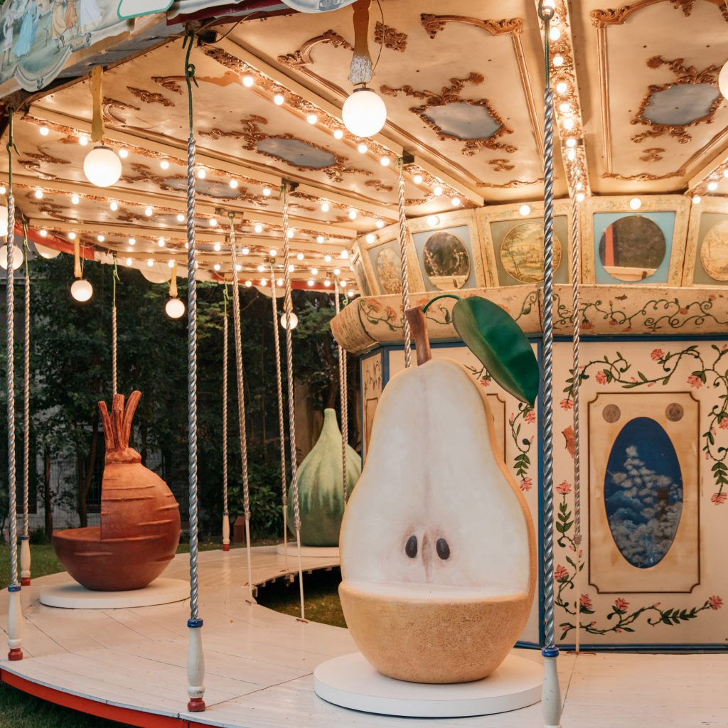 La diseñadora Laila Gohar ha renovado el carrusel tradicional, reemplazando los personajes originales con frutas y verduras de gran tamaño para celebrar su primera colección prêt-à-porter, que se lanza semana del diseño de milán Colaboración con la marca de...