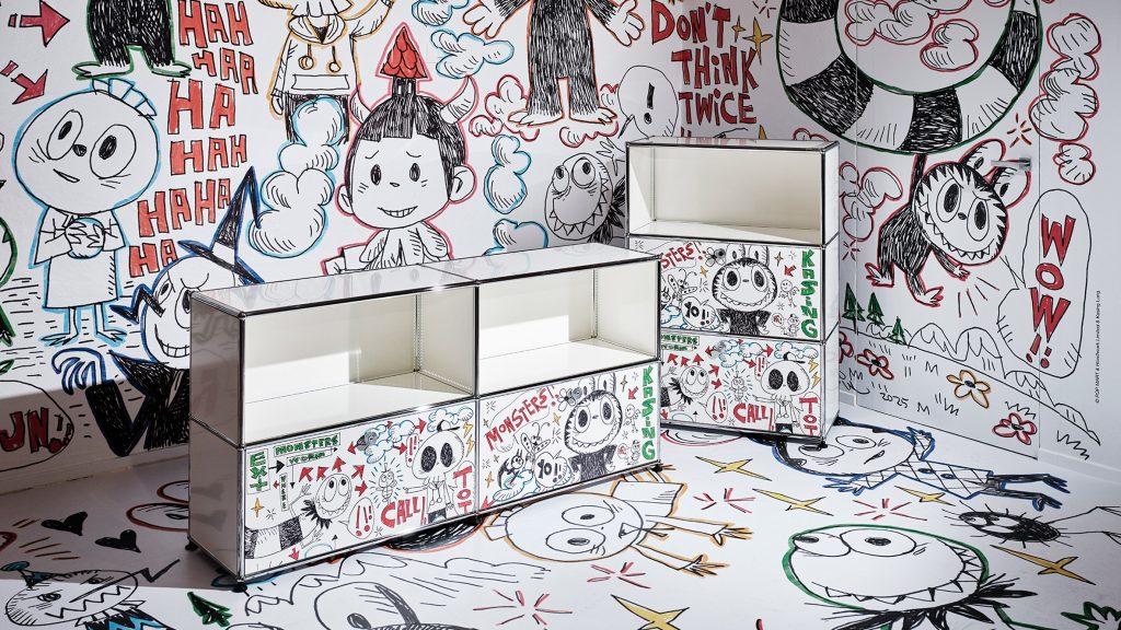 ilustración Kasing Lung El logotipo del infame personaje Labubu está impreso en blanco clásico. USM halle armario Como parte de la colaboración lanzada por el fabricante de muebles suizo en la feria semana del diseño de milán. este ¡Cosas hermosas!...