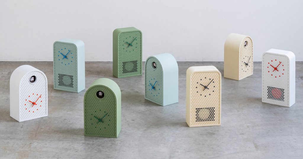 Superficie perforada para péndulos de metal y relojes de cuco Ryosuke Fukosada creó series como MOOV y COO Metal y cuco reloj Péndulos en movimiento y pájaros se muestran a través de ventanas...