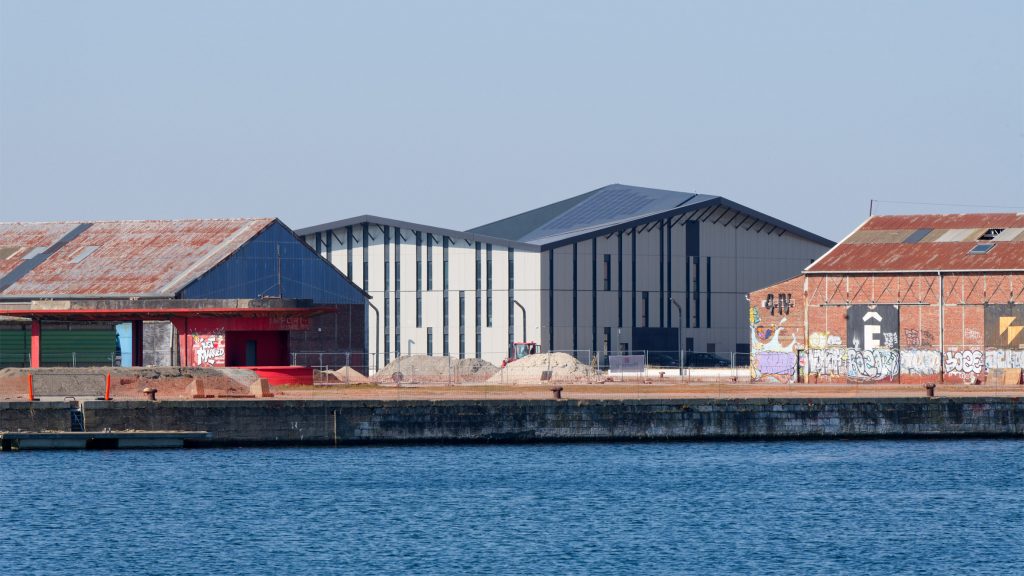El techo facetado rodea el centro. patio Écosystème D, un centro energético y espacio de trabajo de ingeniería en Dunkerque, diseñado por un estudio de arquitectura capa de nieve y Sant van Hove. de acuerdo a capa de nieve y...