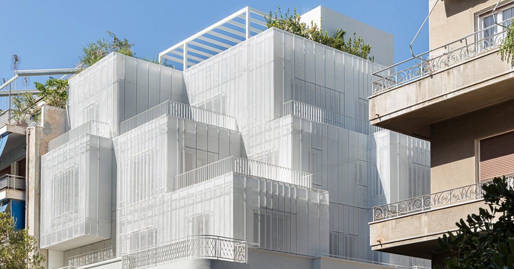 Velo: una intervención en capas en el tejido urbano de Paticia Arid remodeló y amplió un edificio de esquina de dos pisos de 1951 en el distrito de Patisia Atenas convertirse en un híbrido Residencialvivir juntos...