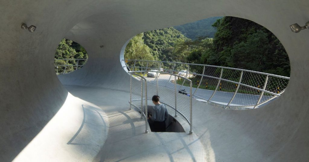 Un pabellón circular de hormigón forma una estación de descanso para bicicletas en la montaña Luofu El bucle de descanso con la vista es pequeño. pabellón Los proyectos de HCCH Studio están ubicados en piedra ...