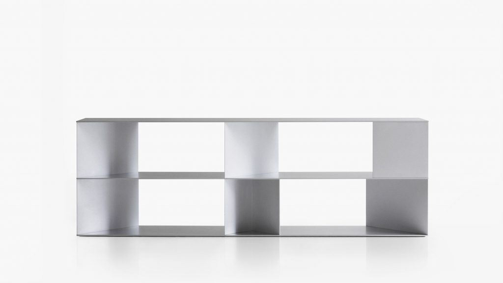 Sala de exposición Dezeen: diseñador Tamura Nao crea un largo y horizontal estantería marca de muebles italianos más lejosLos paneles de aluminio plegados le dan una calidad escultórica. este librero brillante Se trata de una estantería abierta...