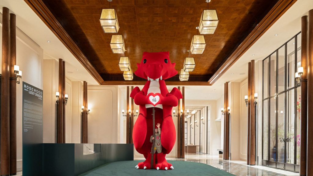 El artista callejero Frankey creó un interesante juego interactivo "Lucky Dragon" escultura En el hotel Rosewood Hong Kong Con un corazón brillante, con el objetivo de "traer alegría". Dragón rojo sentado en el vestíbulo del hotel Palo de rosa Hong...