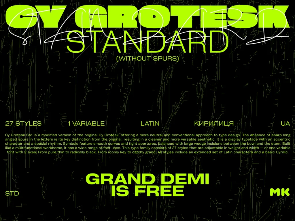 CY Grotesk STD es una fuente grotesk gratuita de Maksym Kobuzan que admite latín y cirílico, formas geométricas limpias y múltiples pesos para uso en pantalla. Kobuzan es un diseñador tipográfico radicado en Kiev, Ucrania, que lanzó la serie CY...