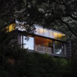 La sala de estar cuenta con un sofá elevado personalizado sobre una plataforma de madera y piso de roble natural, formando el área social de la casa.