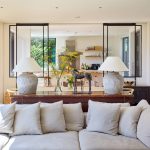 La sala de estar cuenta con un sofá elevado personalizado sobre una plataforma de madera y piso de roble natural, formando el área social de la casa.