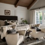 La suite principal cuenta con techos abovedados y cortinas en capas que crean un ambiente tranquilo y acogedor. La carpintería personalizada y la iluminación integrada unen los espacios.